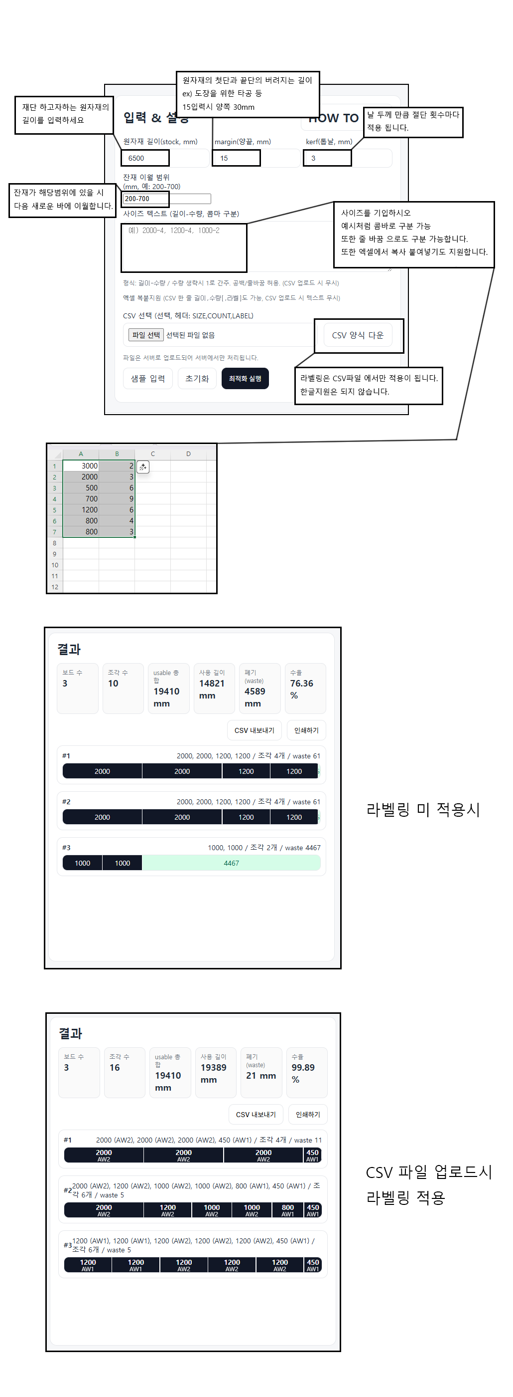 원자재(파이프/각관/목재 등) 한 본의 usable 길이 안에 필요한 컷 리스트를 최대한 채워 보드(Stock) 배치와 waste를 계산해 주는 최적화 도구입니다.